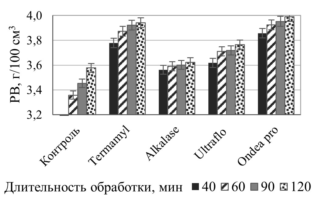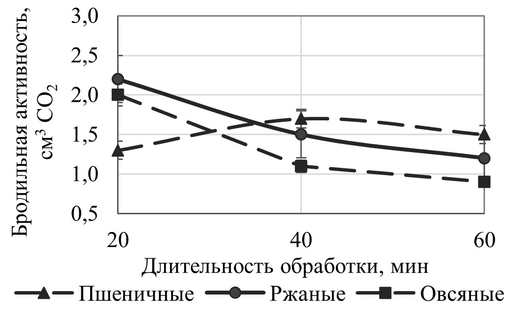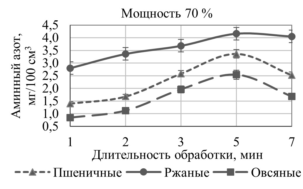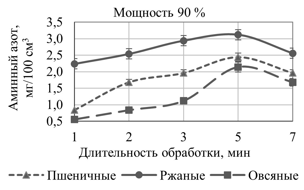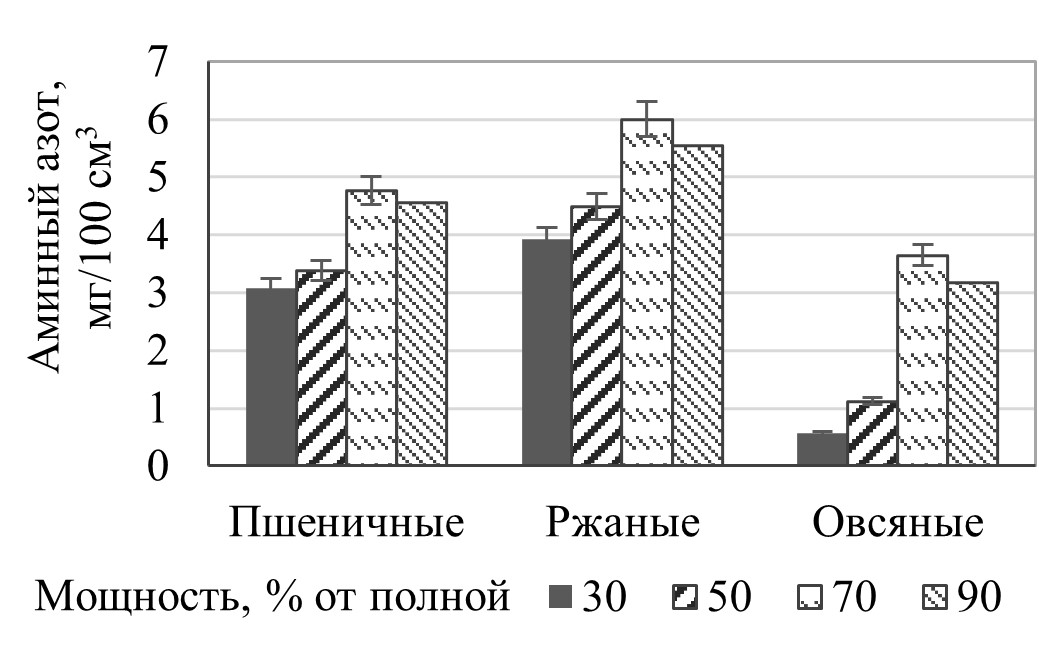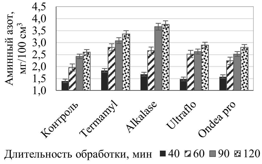 Результаты: Выявлен максимальный выход сухих веществ и азота аминокислот через 5 минут озвучания при мощности УЗ 70 % в ржаном экстракте. Высокое накопление аминного азота в экстрактах обеспечили препараты Alkalase (в 1,4–2 раза по отношению к контролю — отруби без обработки), Ultraflo XL (в 1,1–2,5 раза), Ondea pro (в 1,2–2,3 раза), редуцирующих веществ — Termamyl (в 1,2–3 раза), Ondea pro (в 1,1–3,8 раза), Ultraflo XL (в 1,2–1,7 раза). По абсолютным значениям исследуемых показателей преимущество у ржаных и пшеничных экстрактов при любом способе получения. Бродильная активность дрожжей после 20 минут обработки УЗ экстрактами (ржаным/овсяным) в среднем на 40 % выше в сравнении с пшеничным экстрактом, после выдержки с ферментативными экстрактами (Termamyl и Ondea pro) — на 170 и 260 % больше контроля.