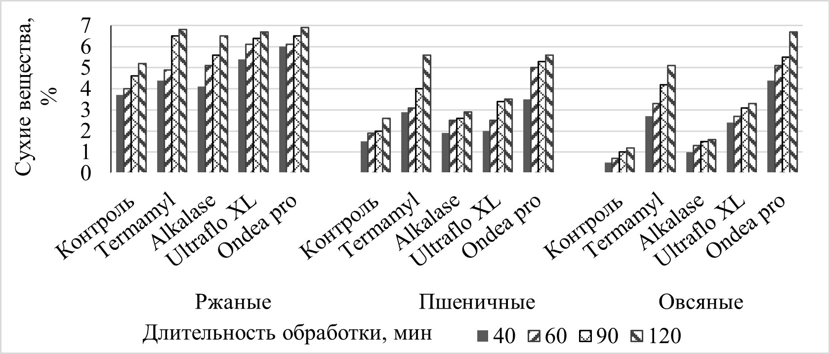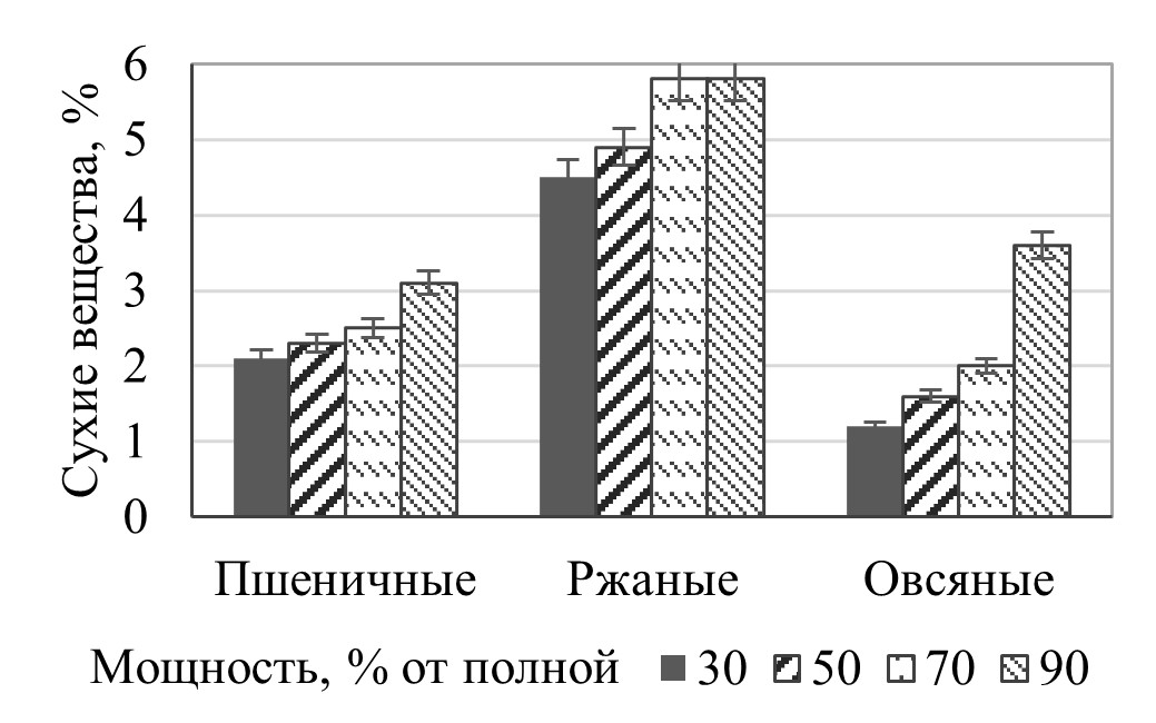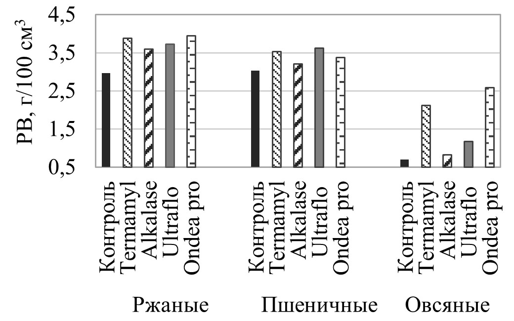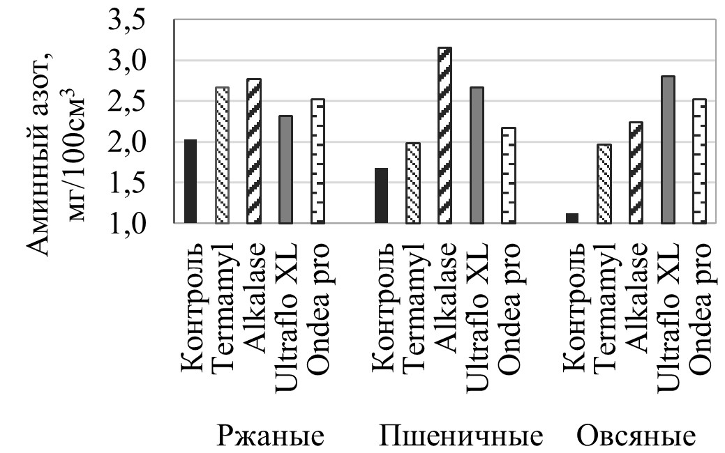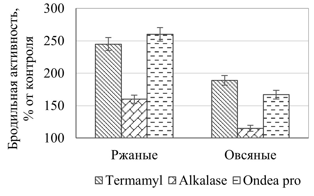 Результаты: Выявлен максимальный выход сухих веществ и азота аминокислот через 5 минут озвучания при мощности УЗ 70 % в ржаном экстракте. Высокое накопление аминного азота в экстрактах обеспечили препараты Alkalase (в 1,4–2 раза по отношению к контролю — отруби без обработки), Ultraflo XL (в 1,1–2,5 раза), Ondea pro (в 1,2–2,3 раза), редуцирующих веществ — Termamyl (в 1,2–3 раза), Ondea pro (в 1,1–3,8 раза), Ultraflo XL (в 1,2–1,7 раза). По абсолютным значениям исследуемых показателей преимущество у ржаных и пшеничных экстрактов при любом способе получения. Бродильная активность дрожжей после 20 минут обработки УЗ экстрактами (ржаным/овсяным) в среднем на 40 % выше в сравнении с пшеничным экстрактом, после выдержки с ферментативными экстрактами (Termamyl и Ondea pro) — на 170 и 260 % больше контроля.