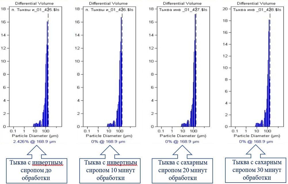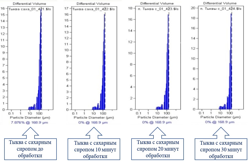 Материалы и методы: Объекты исследования: образцы пюре тыквы промышленного производства, кондитерские полуфабрикаты, приготовленные в лабораторных условиях смешиванием пюре тыквы и сахарного/инвертного сиропа в соотношении 50:50. Кавитационную обработку проводили на ультразвуковой установке «Сиринкс 250К», органолептическую оценку проводили дегустационной комиссией и на приборе «Электронный нос» «VOCmeter», дисперсность определяли на лазерном дифрактометре «Beckman Coulter».