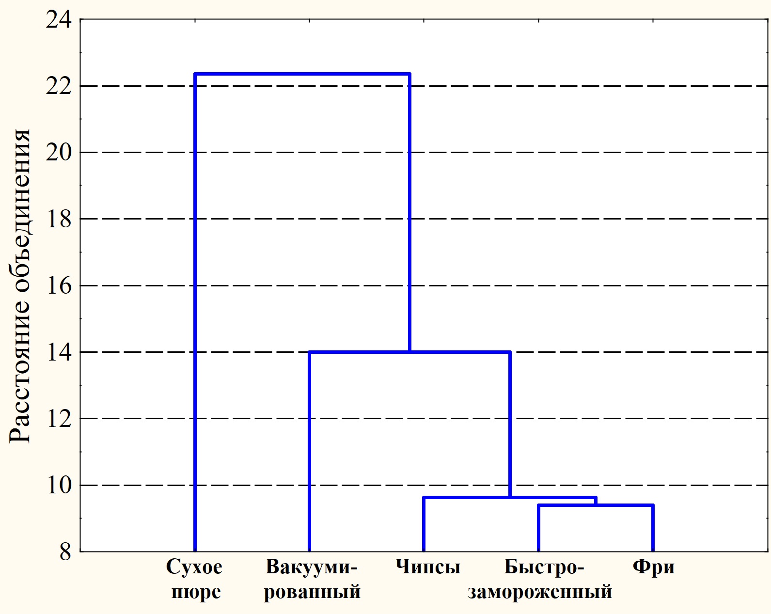 Введение: В России промышленным способом производится 7-8 млн. т картофеля в год и дальнейший рост производства данной культуры в ближайшее время будет происходить в основном за счет развития сектора переработки. Наиболее востребованные картофелепродукты – фри, чипсы, сухое картофельное пюре, быстрозамороженный и вакуумированный картофель. Их качество обусловлено главным образом сортовыми особенностями картофеля, проявляющимися в содержании в клубнях крахмала и редуцирующих сахаров. Однако группировка картофелепродуктов в зависимости от биохимического состава клубней, равно как и оценка пригодности сортов на те или иные виды переработки до сих пор проводилась лишь интуитивно и исходя из общих соображений, т.е. без строгого математического обоснования.