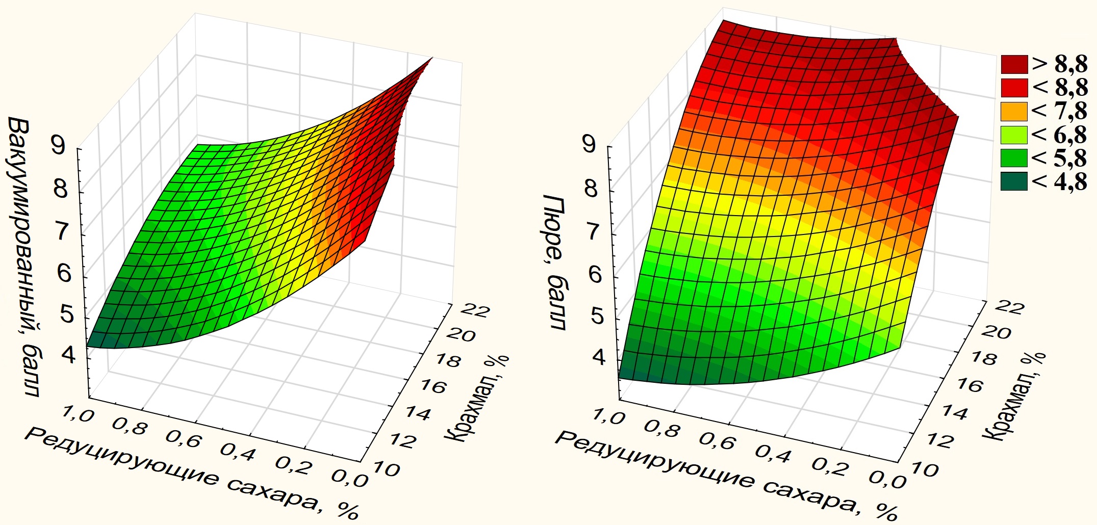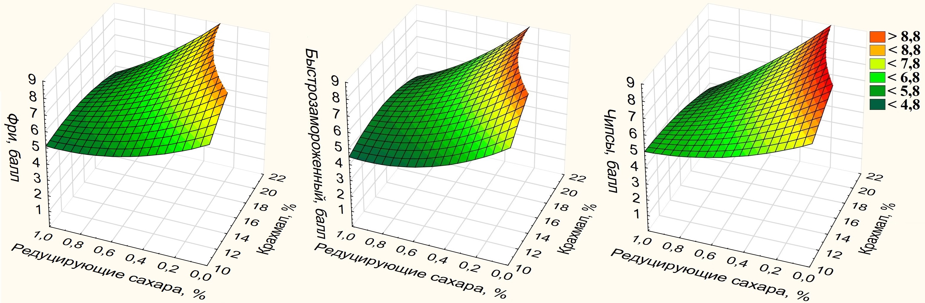 Материалы и методы: Исследования проводили на 58 сортах картофеля различного срока созревания. Картофелепродукты (фри, чипсы, сухое картофельное пюре, быстрозамороженный и вакуумированный картофель) оценивали согласно методическим указаниям по оценке сортов картофеля на пригодность к переработке и хранению. Содержание крахмала определяли весовым методом по удельной массе клубней картофеля в воздухе и воде, содержание редуцирующих сахаров – спектрофотометрическим методом Самнера. Математическую обработку данных осуществляли методами дисперсионного, корреляционного, регрессионного и кластерного анализа.