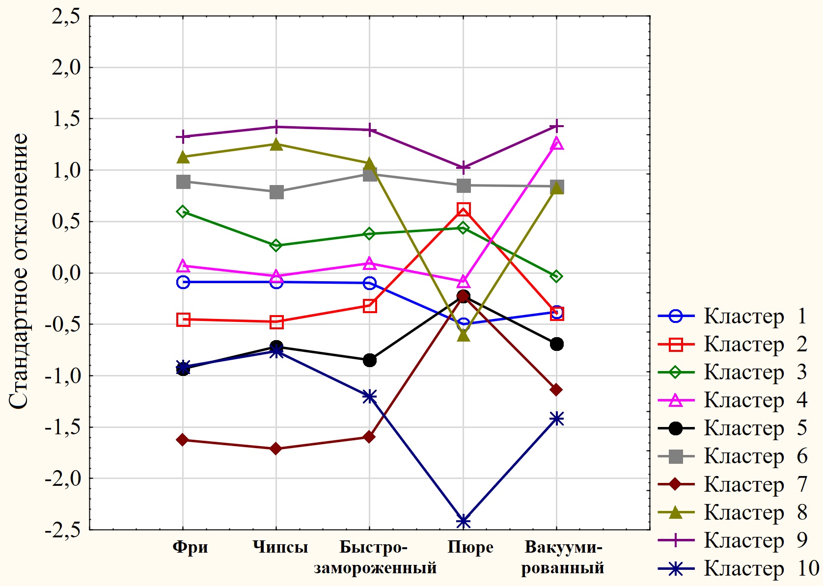 Результаты: Впервые проведена научно-обоснованная группировка картофелепродуктов на кластеры с обоснованием требований к сырью по содержанию крахмала и редуцирующих сахаров. Кластерным анализом методом К-средних для целей промпереработки доказано преимущество сортов картофеля более поздних сроков созревания, из 58 изученных выделены и рекомендованы в производство 10 наилучших универсальных сортов картофеля: Бабынинский, Фарн, Артур, Восторг, Евпатий, Кавалер, Надежда, Орлан, Розовый чародей, Чайка.